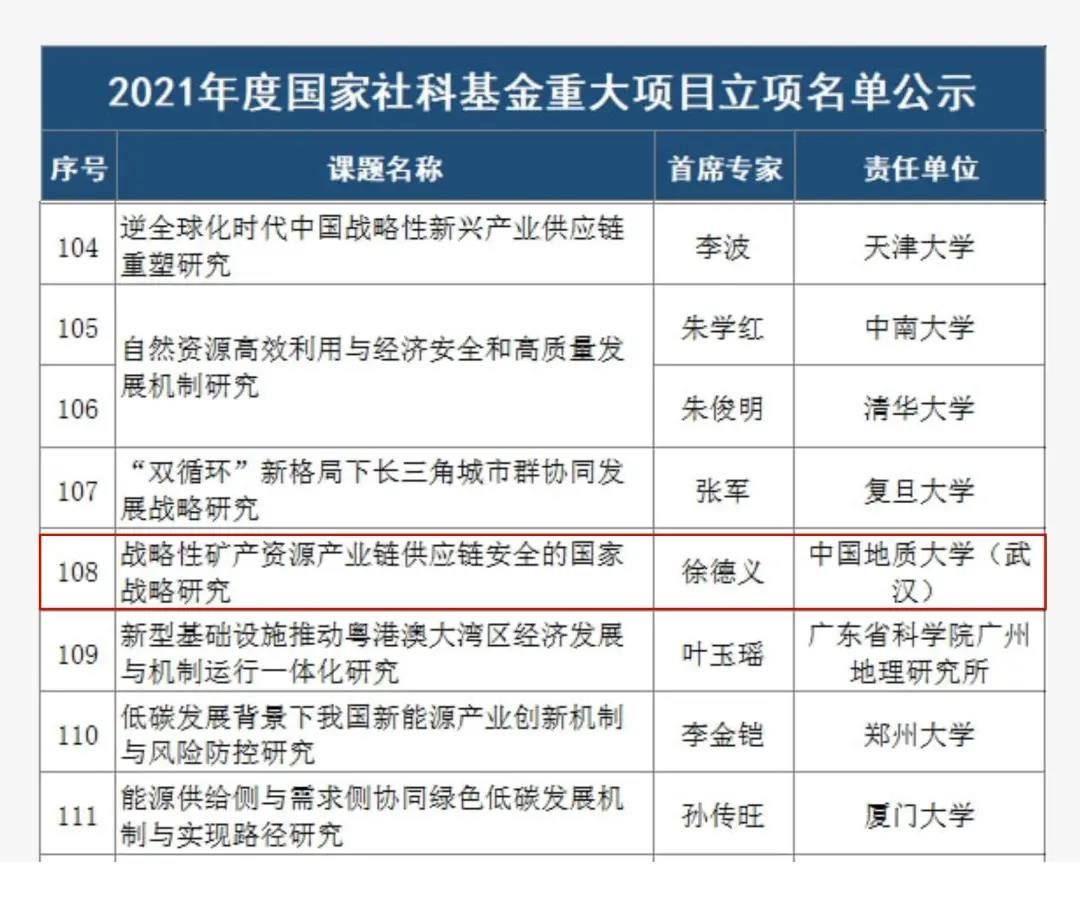 近日,全國哲學社會科學工作辦公室公布了2021年度國家社會科學基金重大項目立項名單,我校經濟管理學院徐德義教授任首席專家投標的《戰略性礦產資源產業鏈供應鏈安全的國家戰略研究》獲批立項。經濟管理學院張偉教授申報的《綠色金融推動碳中和目標實現的理論體系、政策框架與創新路徑研究》獲得國家社會科學基金重點項目資助。
