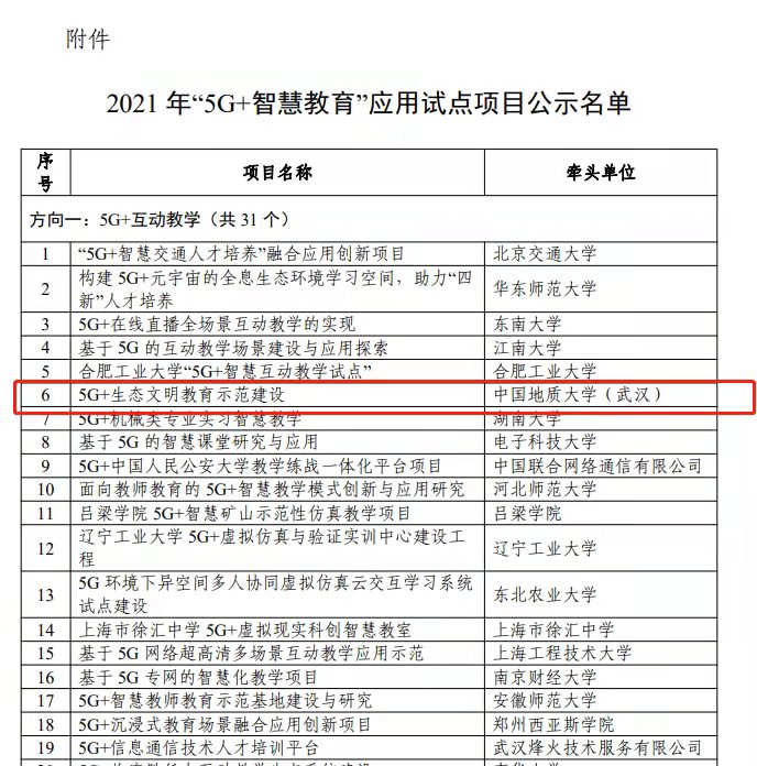 地大新聞網(wǎng)訊:近日,工業(yè)和信息化部、教育部聯(lián)合公示2021年“5G+智慧教育”應(yīng)用試點(diǎn)項(xiàng)目入圍名單,我校牽頭申報(bào)的“5G+生態(tài)文明教育示范建設(shè)”項(xiàng)目成功入選。