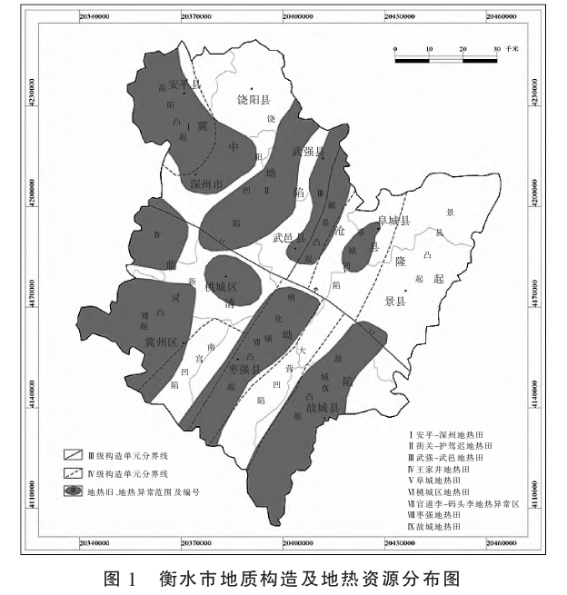 近年來,常規資源枯竭、全球氣候變暖、霧霾不斷加劇等現象的出現,使得能源供給與環境保護已成為當今社會面臨的主要問題。地熱資源以其資源儲量巨大、分布廣泛、開發利用穩定、安全、清潔、高效和可再生的獨特優勢,成為實現能源生產革命、緩解環境壓力的戰略性資源。衡水區域地熱資源較豐富,全市新生界平均地溫梯度值3.16℃/100 m,初步查明地熱田及地熱異常區 9處,分別為:安平-深州地熱田、街關-護
